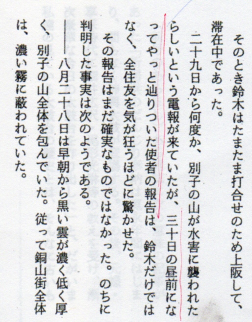 「29日から何度か、別子の山が水害に襲われたらしいという電報が来ていたが、 ・・・