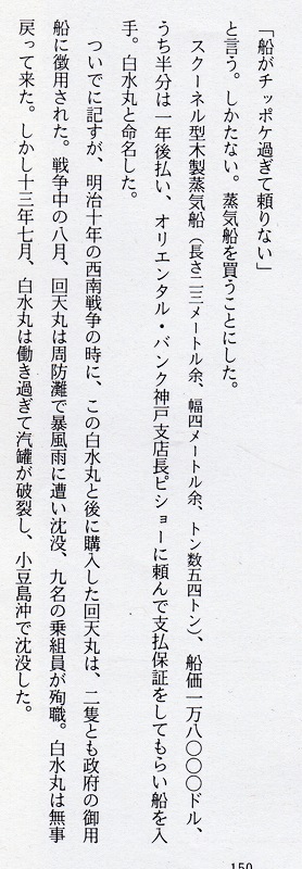 調べて行くと、明治5年(1872)11月、英国人所有の木造蒸気船 神戸丸(54t・2本マスト・長さ24m・幅4,5m)を18,000ドルで購入し、