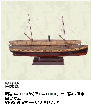明治7年 6月から阪神と新居浜間を就航し、別子銅山の銅と、一般貨客の運送を開始した。