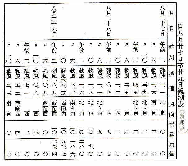 ”この時凡そ午後11時30分、風雨共に静穏に帰し天晴れ雲散じ片月微光を放ちて凄然たり”