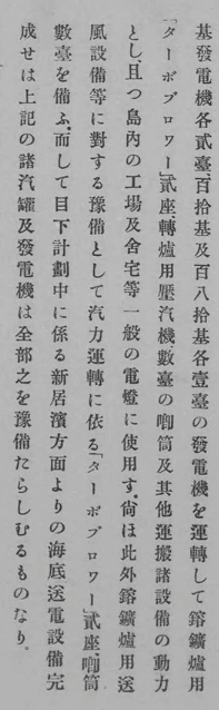 これは、当時 世界最長の海底送電線でした。 大正11年9/23日敷設工事開始。 10/15完成。