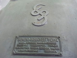 フォイト社のペルトン水車(ー1910とある。100年前の製造)     シーメンス社の発電機の名板