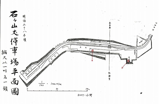 十文字の中心の、光が、石ヶ山丈停車場の、プラットホームのレベルです。 少し上の、横に広がる緑のグリーンベルトを停車場だと思っている方がいます。 が、 停車場の、木々が高く育ってきていますので、グリーンベルトは、木の先端部分で、 プラットホームのレベルは、少し下。写真の、位置になります。