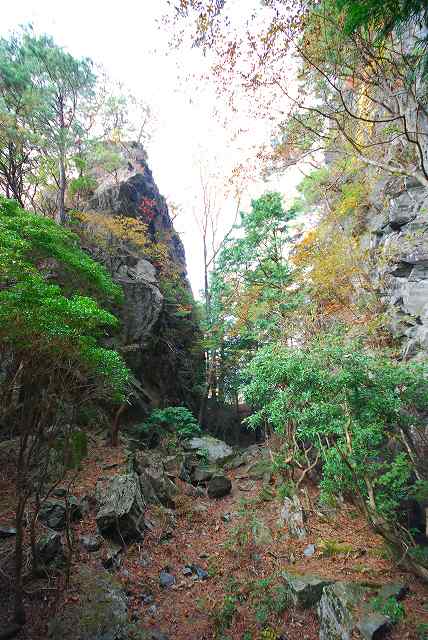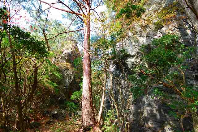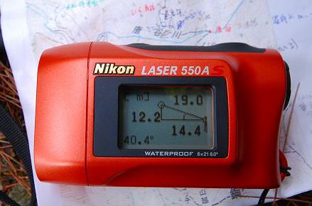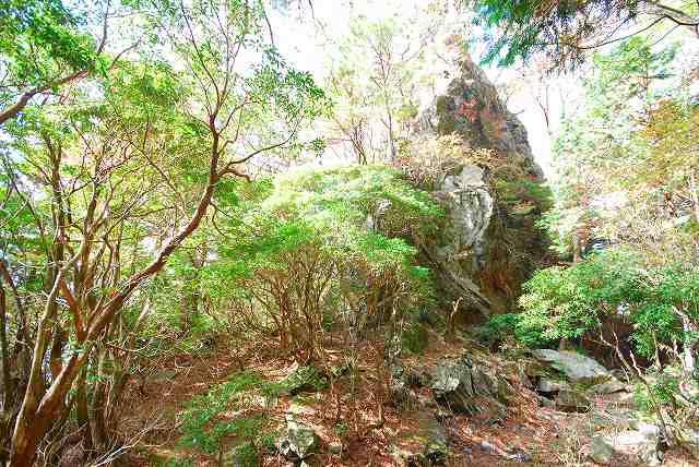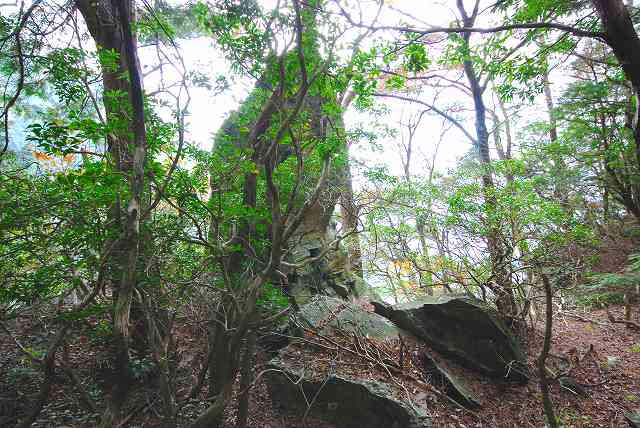 岩の左が、旧・牛車道。 右が、「切り通し」。 レーザー距離計で、岩の高さを、測ってみました。 約12m位でした。