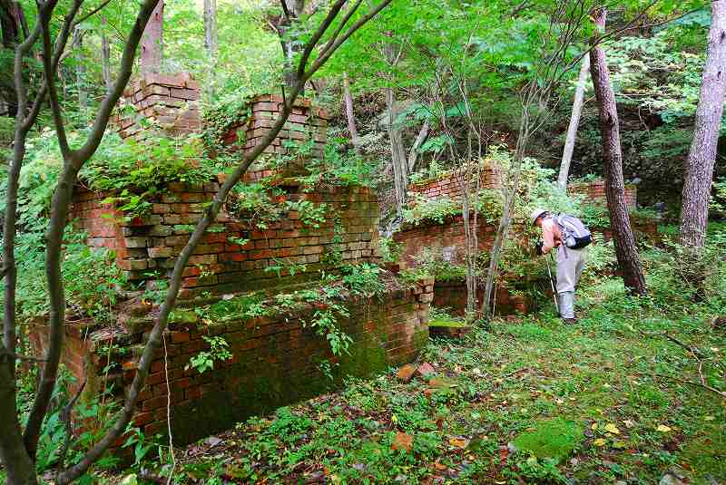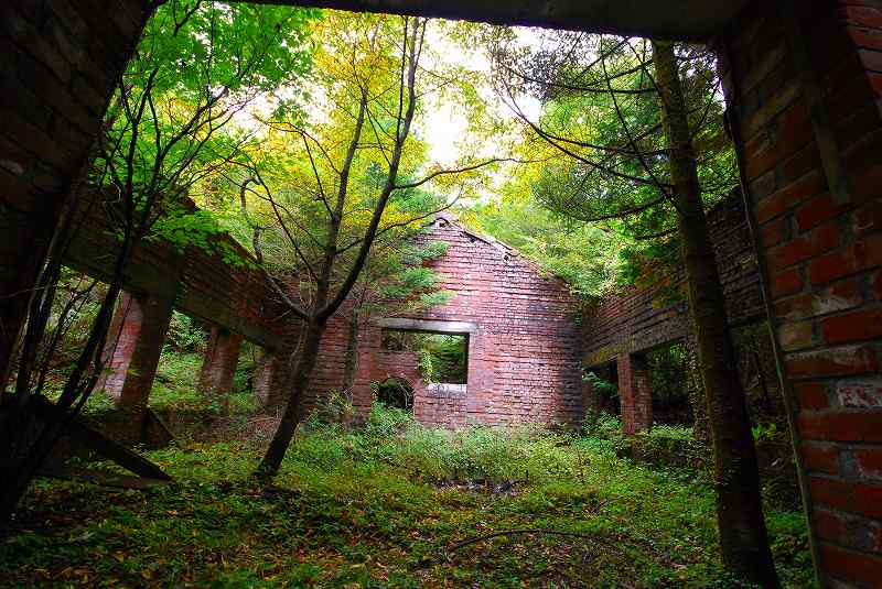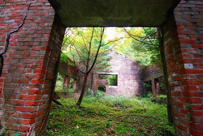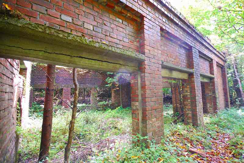 東延斜坑の、真後ろに機械場跡があります。屋根は落ちていて、煉瓦の壁しかありません。