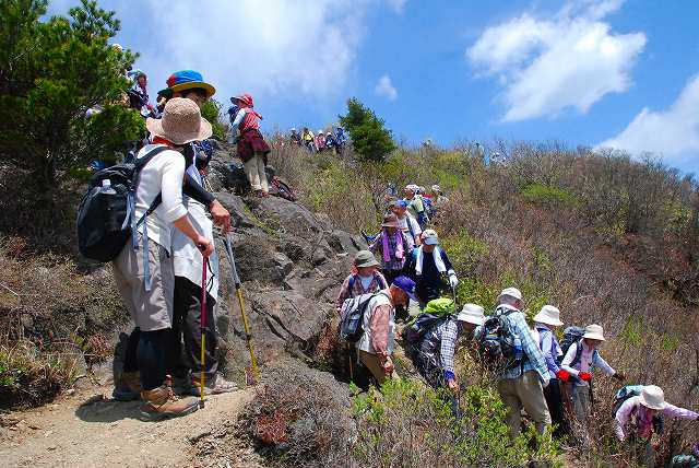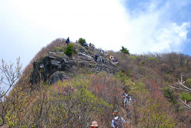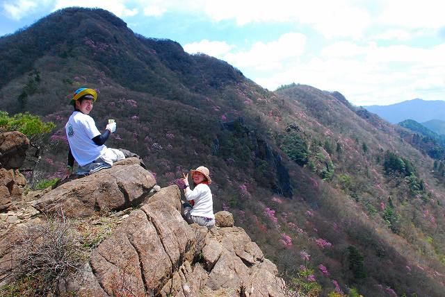この後、アケボノツツジの、絶好のビューポイントである北斜面にある 「兜岩」まで、急坂を下っていきます。