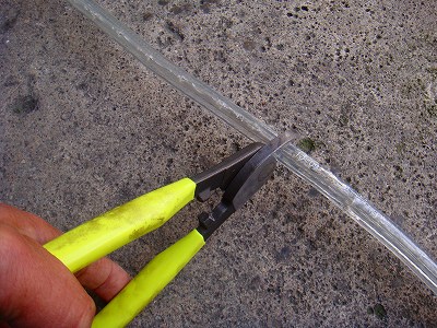 電線カッターで、切ります。チューブが、逃げないし、切り口が、キレイ。
