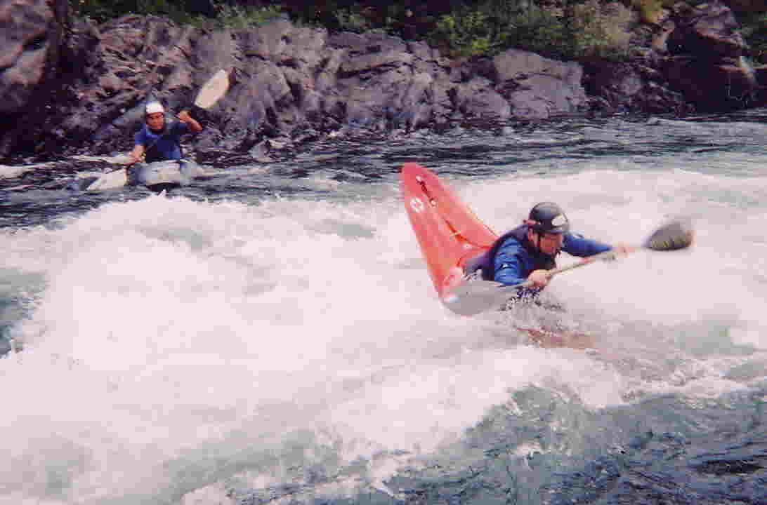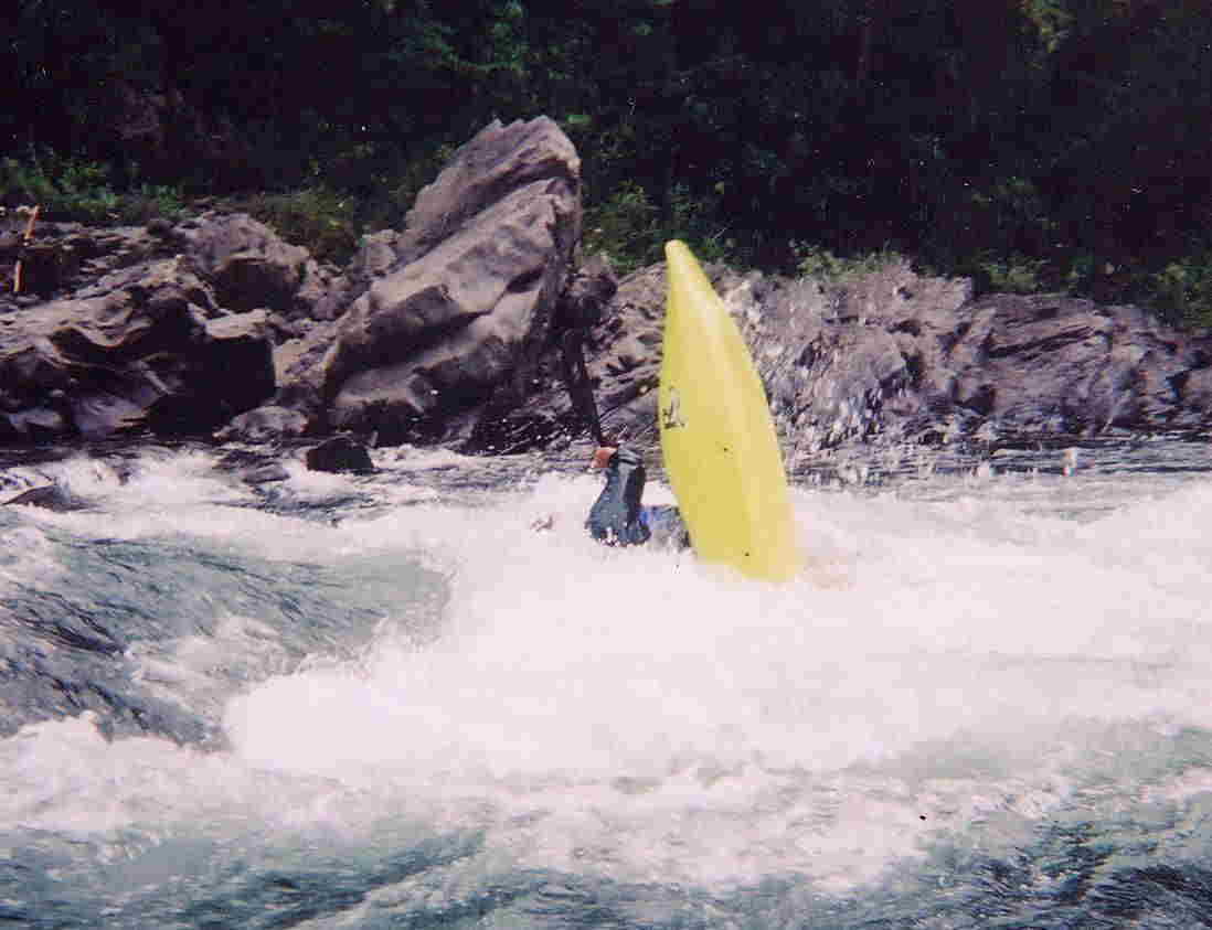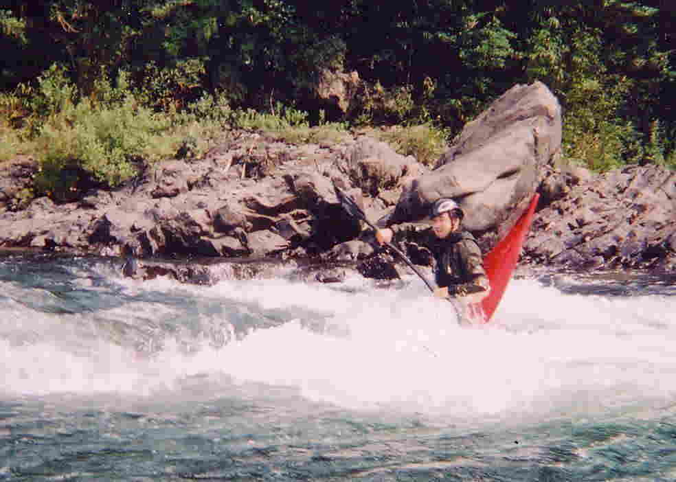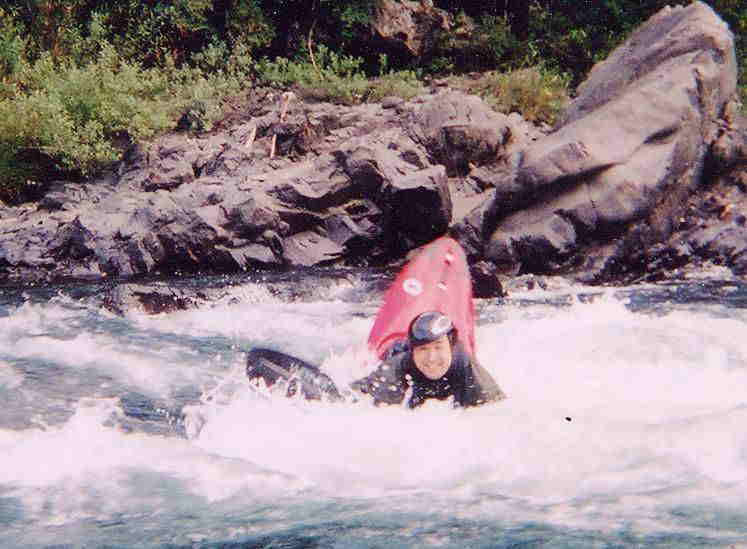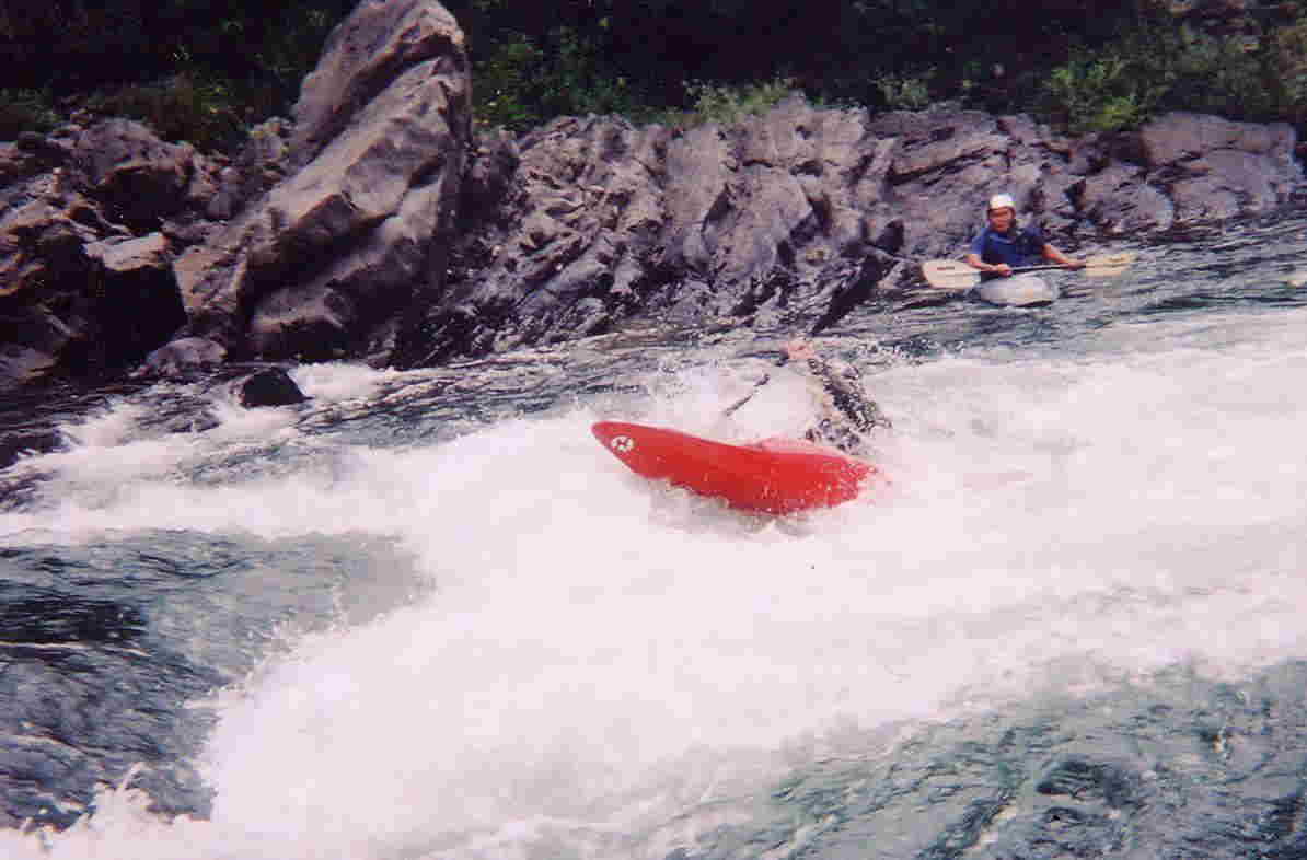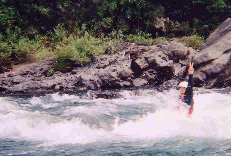 ”三島の轟”の 全景です。 いつも遊んでいるのは、川の下手。一番下の白くなっている所です。 本日も、ここで1時間余り遊びました。水量少な目でしたが、ホールに入りやすく、出されてもあまり流されずに リ・エントリーしやすく、延々と遊びました。