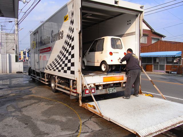 大型トラックが、到着しました。 リフト付きの、トラックから降ろそうとしているのは、タケオカ自動車工芸の、ミリュー 不動車という事で、安く手に入れましたが、運送料の方が高かった ・・・ 今から、動くように努力します。 WAKU WAKU 楽しみです !!!!!