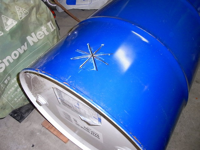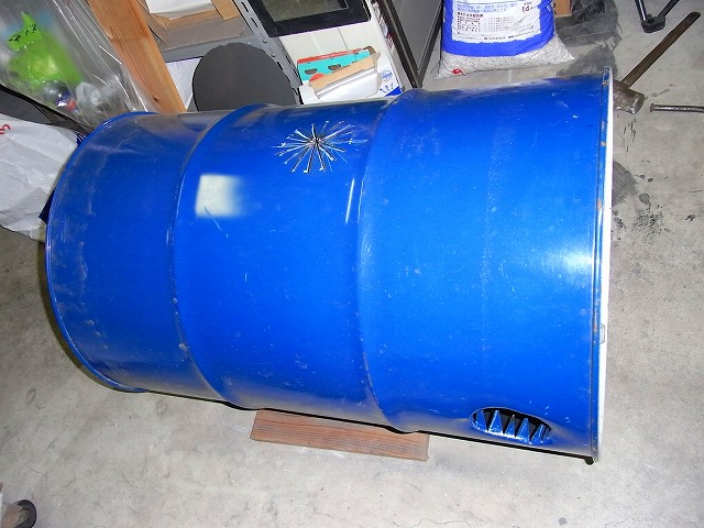 右は、ドラム缶の内部から見た写真です。ここに、本体の、焚口のステンレス・エビ曲がり管を入れます。
