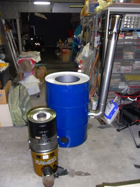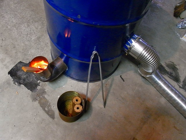 手前の、ロケットストーブ本体を、加工した青いドラム缶に入れます。右が、入れた写真。焚口の長さの関係で、オフセットしてしまった。