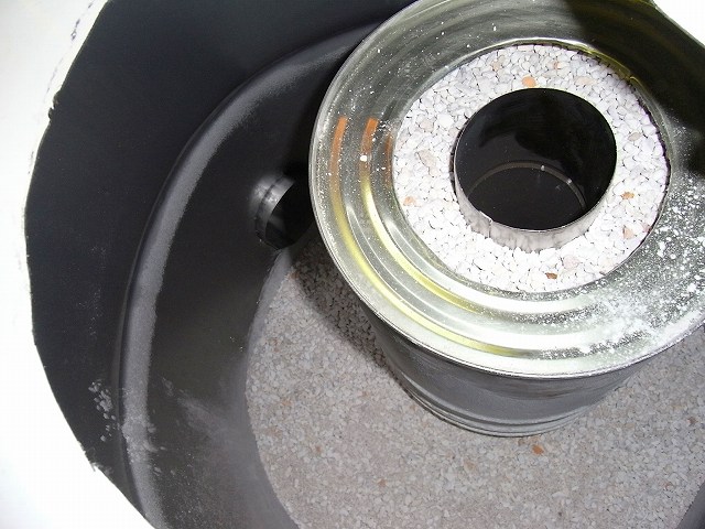 ドラム缶の排気口の下まで、パーライトを入れる。ペール缶には、バーミキュライトを入れてあるのだが、細かいので飛ばない様に