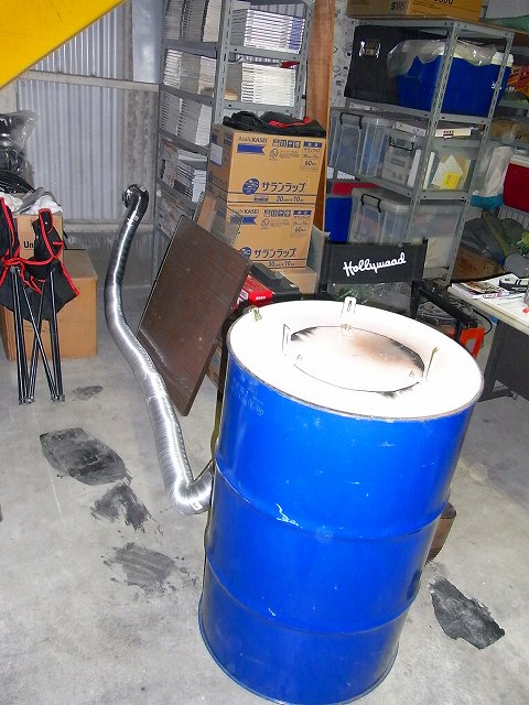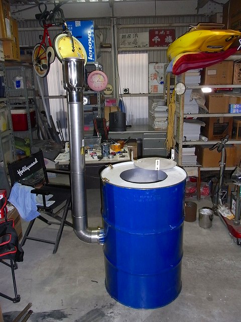 マキが弾けた時に、火の粉が煙突から出てくるのを防ぐ為に、ドラム缶の中に、本体を入れることにしました。