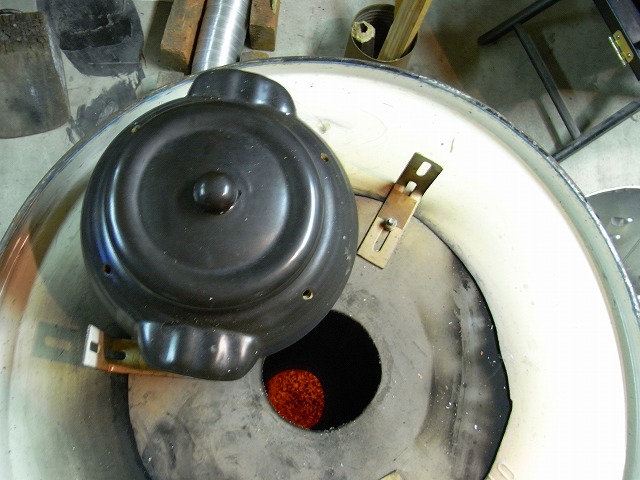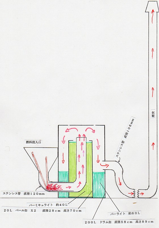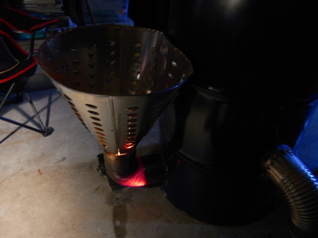 上の写真のエビ曲り管より、安定して木材が投入できます。 火力も強くなりました。